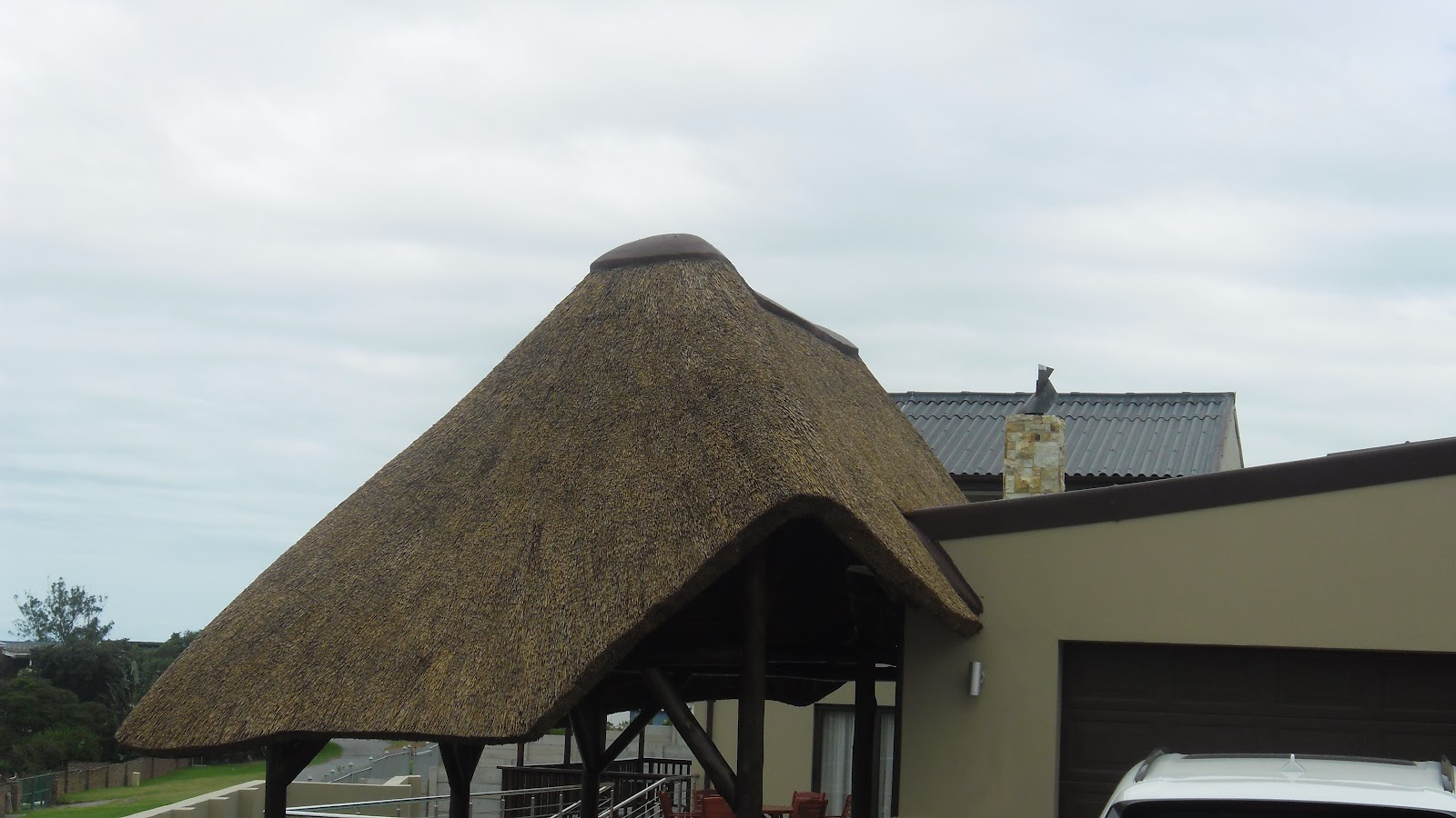 Large thatch lapa with interesting shaping and built in braai & chimney |